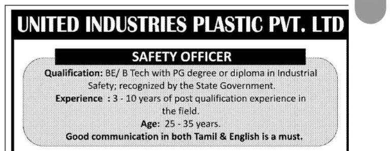 Safety Officer Job Vacancy in United Industries Plastic Pvt. Ltd